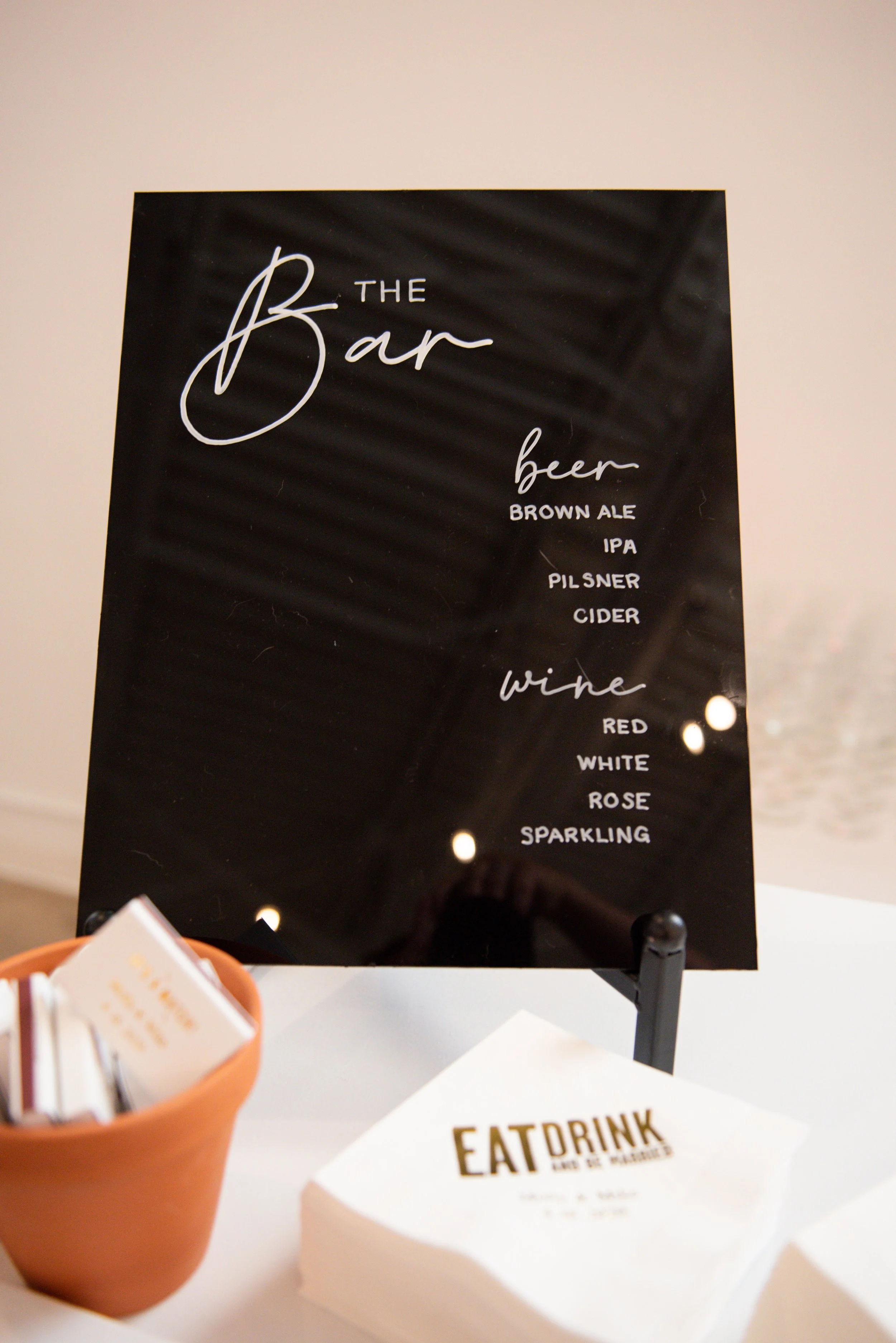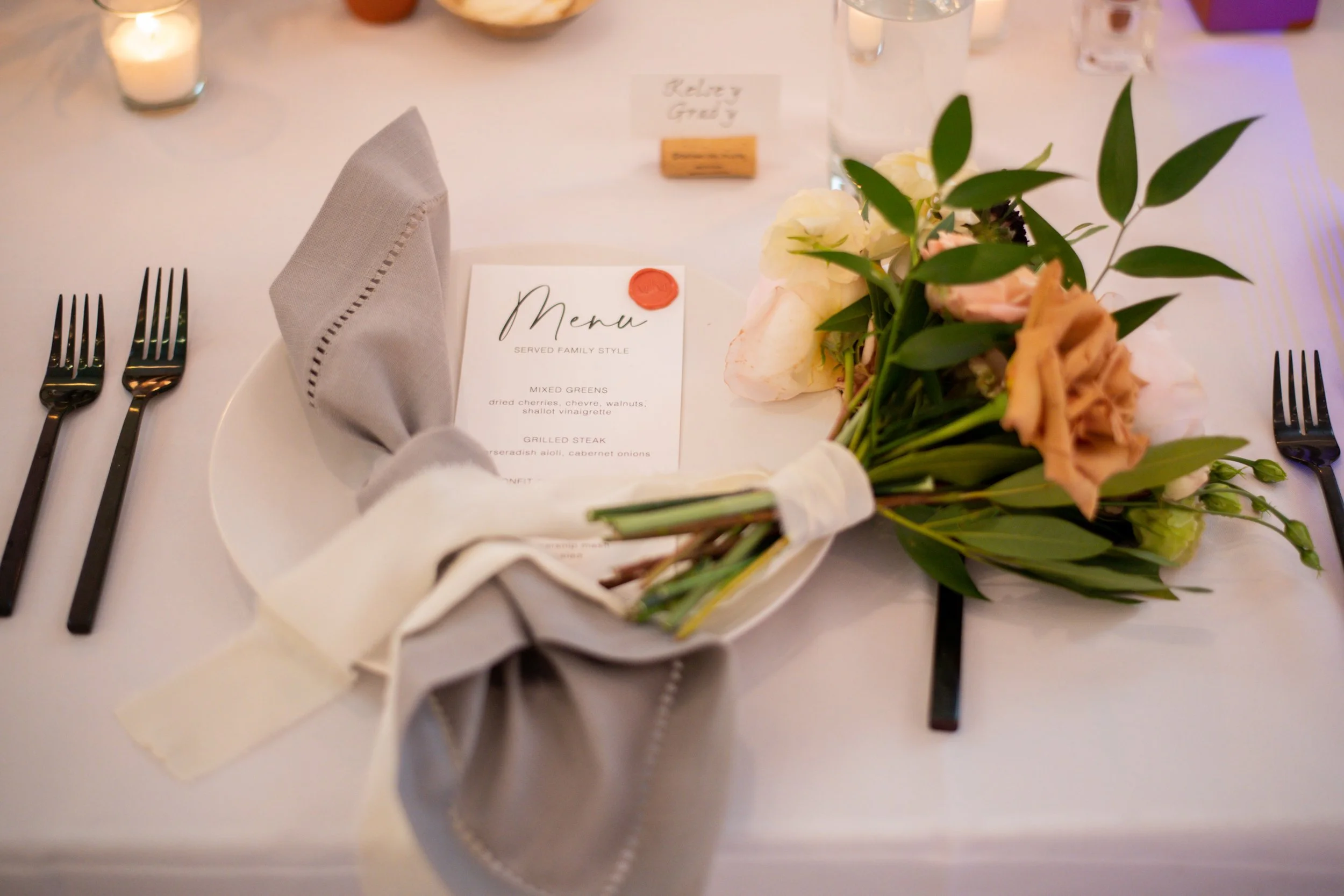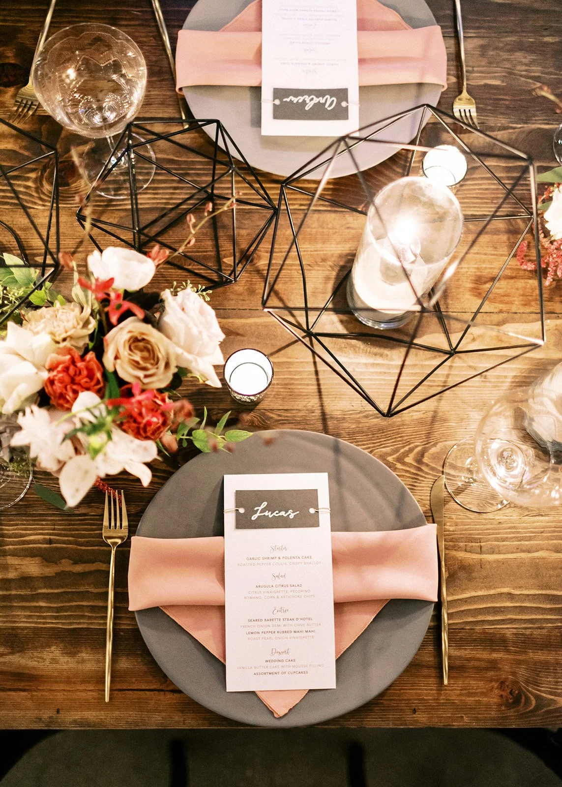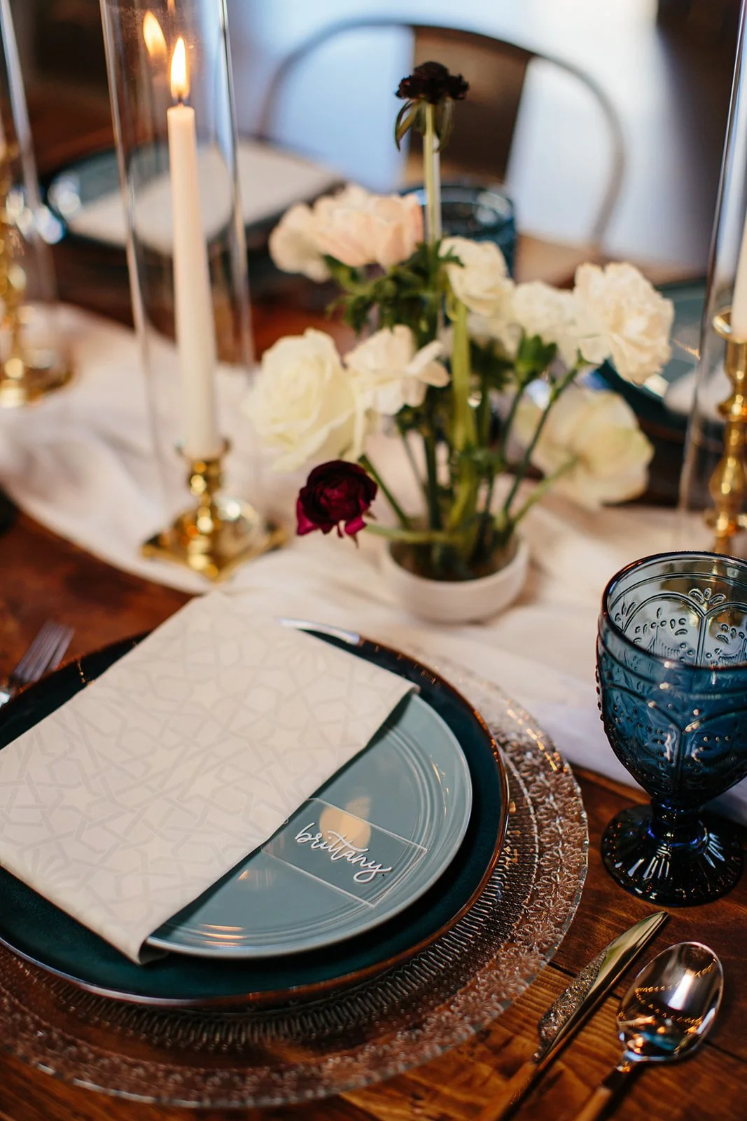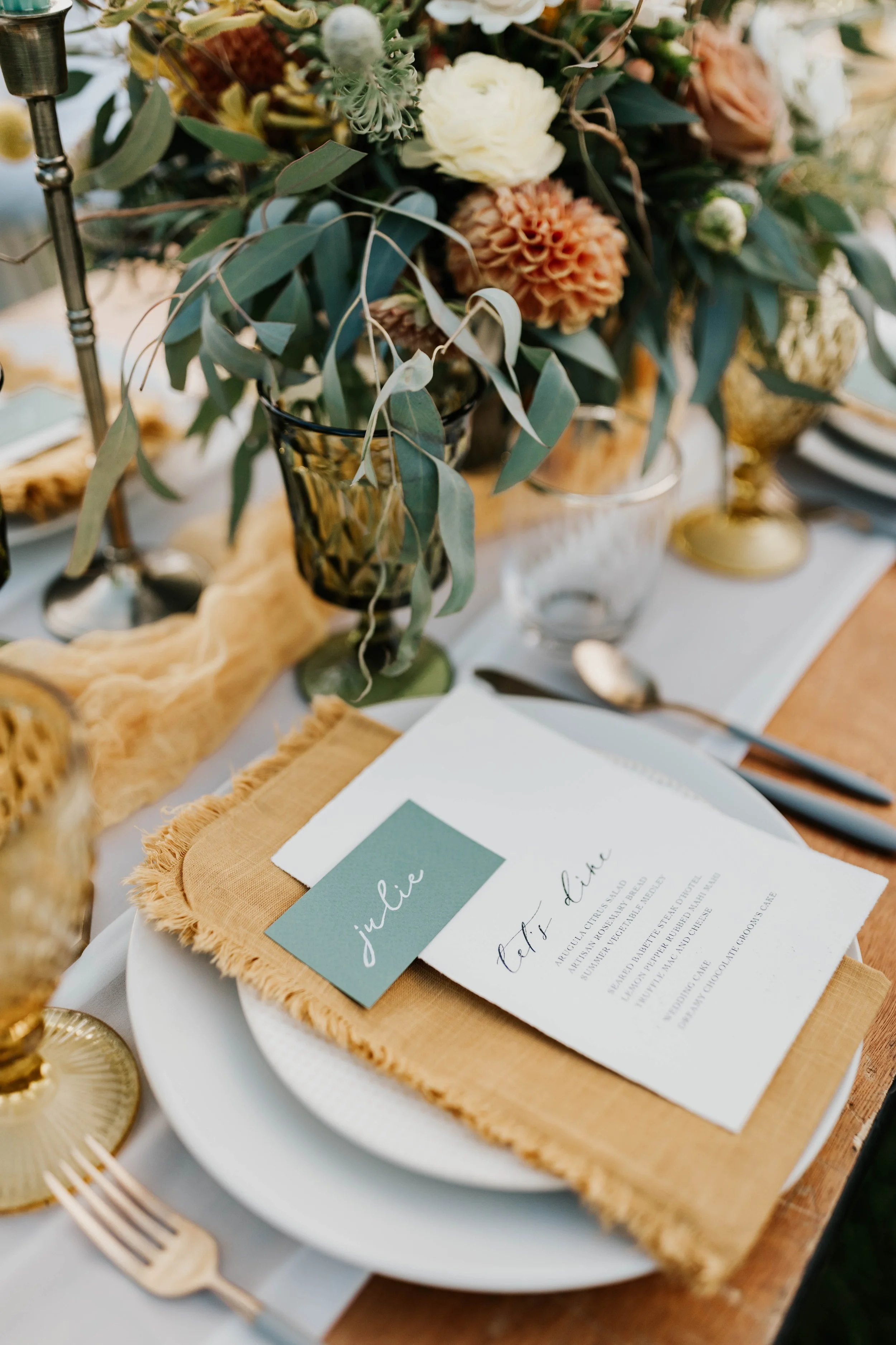 Everything from menus with wax seal stamps to acrylic table numbers to white ink place cards.